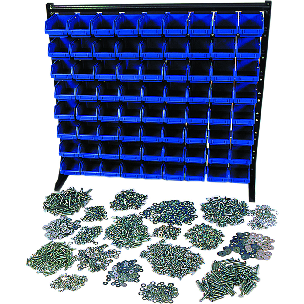 • består af stålreol med 72 lagerkasser L 160/140 x B 100 x T 75 mm, af salgfast polystyrol) og diverse DIN-dele